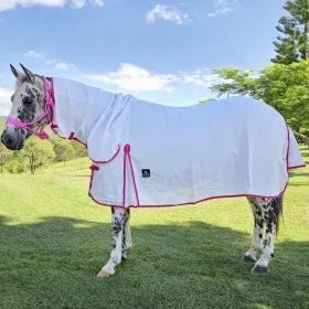 The Mac Tack Flag Combo(white with 2 tone pink trim) 190GSM Lightweight Neck Combo is your go-to solution for keeping your horse cool and protected during the hotter months.